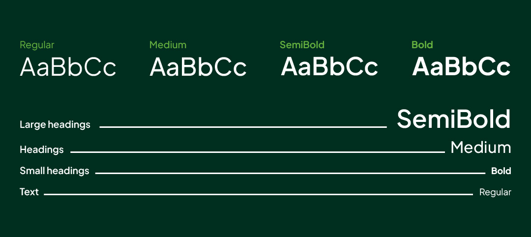 For large headings, we use Semi-Bold. For regular headings, we use Medium, and for regular sized copy we use Regular. Bold can be used to emphasize small headings.